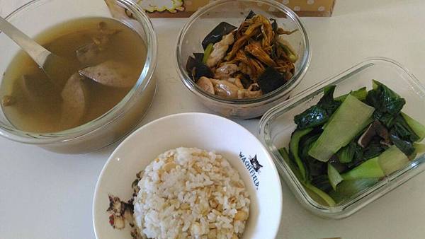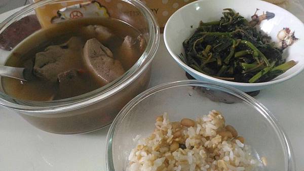二是菜色普通,標準一餐就是一碗五穀飯,一碗青菜,一碗有肉的湯 (如下圖)